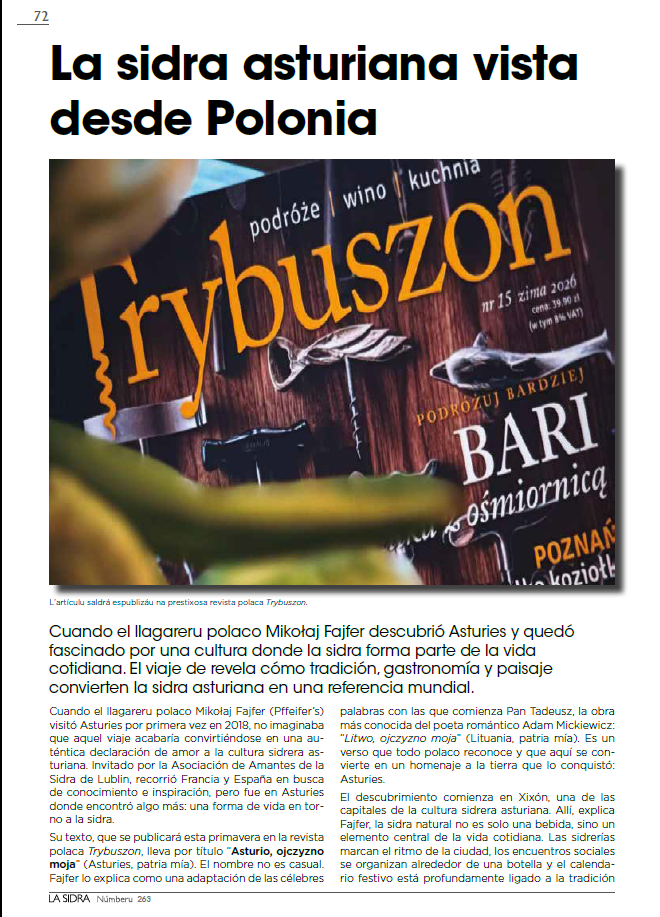 Miło nam poinformować, że w marcowym wydaniu hiszpańskojęzycznego czasopisma cydrowego “La Sidra” ukazał się tekst o artykule Mikołaja Fajfera z najnowszego wydania “Trybuszona” Asturio, ojczyzno moja!. Artykuł do przeczytania TU lub w papierowym wydaniu “Trybuszona”, które wciąż jest w sprzedaży. Zapraszamy do lektury.