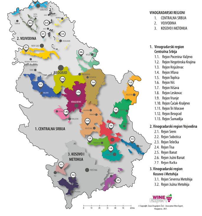 W wyniku reformy prowadzonej przez władze winiarskie od 2008 do 2013 roku Serbia została podzielona na trzy regiony (vinogradarski region), 22 subregiony (vinogradarski rejon), około 70 mikroregionów (vinogorje) oraz ogromną liczbę siedlisk w ramach mikroregionów (lokalitet/potes). Do tego czasu funkcjonował system stworzony w latach 70. XX w. dzielący kraj na dziewięć regionów winiarskich.